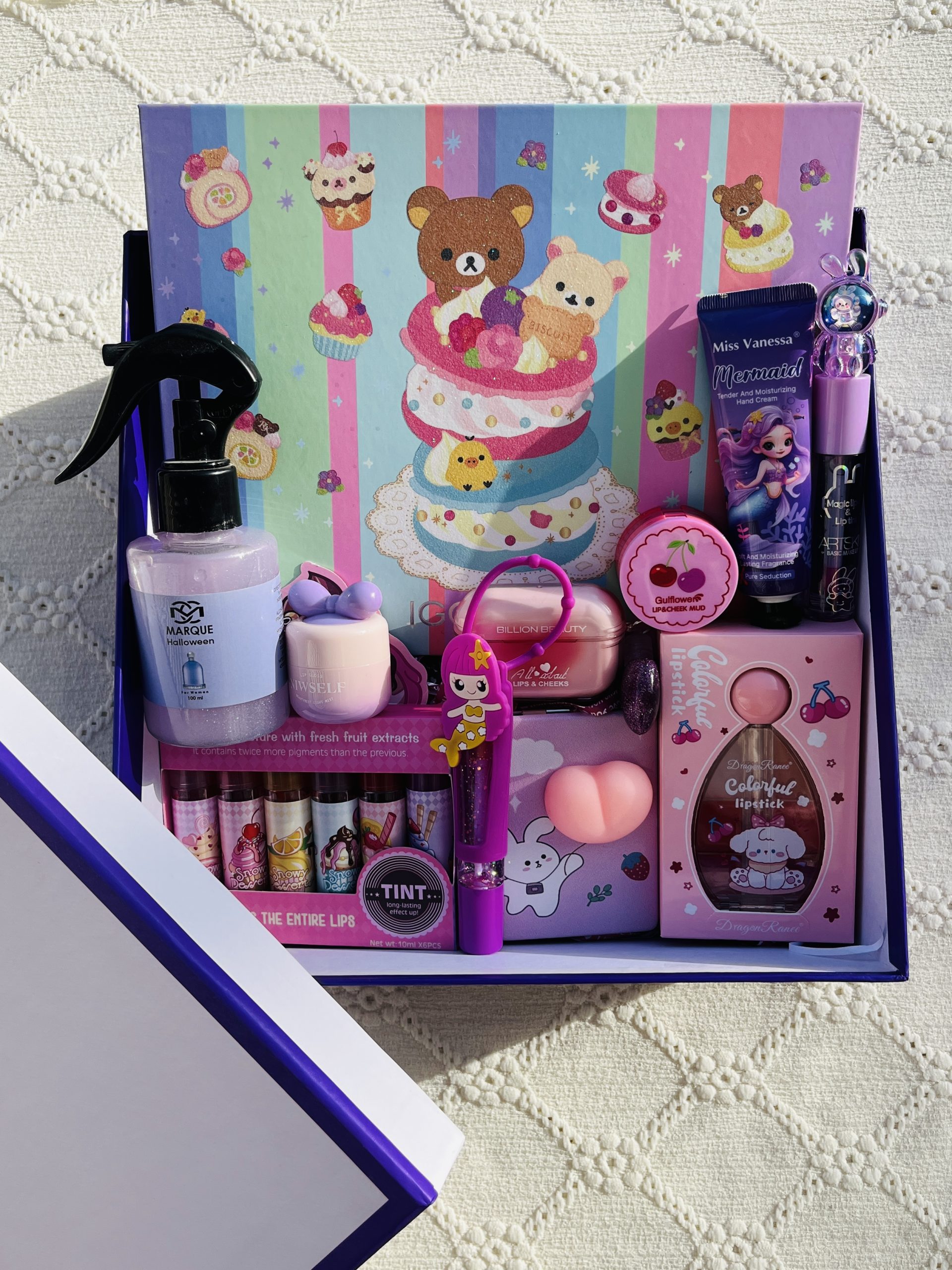 پالت بزرگ سایه ، عطرمو،رژ پاپیون،پک لیپ گلاس،نرم کننده، برق لب،رژ ایرپادی،رژ کره ای،آینه ،پک تینت،لیپ گلاس جاسوییجی همراه باکس
